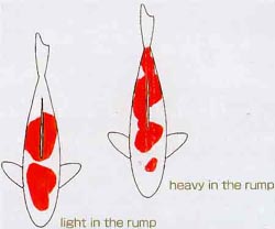 Van een koi met een paar rode vlekken op het achterste gedeelte van het lichaam wordt gezegd “Licht van het staartstuk” (SHIRI GA KARUI). Bij hen die veel op het achterste gedeelte hebben zegt men “Zwaar op de stuit”(SHIRI GA OMOI). Geen van beiden is goed omwille van gebrek aan evenwicht.