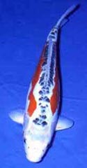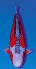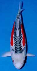 Bij deze SHUSUI reikt het rood dat zich normaal op de flanken bevindt, tot tegen de rugvin en bedekt zodoende heel de rug.