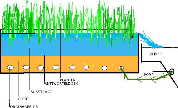 Veel liefhebbers willen te veel vissen in de vijver, en dan gebeurt het nogal eens dat het water dusdanig vervuilt dat de aanwezige planten het water niet in balans kunnen houden .Nu zijn er de laatste jaren nogal wat filters en filtersystemen op de markt gekomen die wij prachtig als hulpmiddel kunnen toepassen en mits van voldoende capaciteit voor prima resultaten zorgen. Je hoort steeds vaker de wens, dat men naar mogelijkheden zoekt om het water op een zo natuurlijk mogelijke manier helder en rein te houden. Het gebruik van een moeras/plantenfilter kan zeer goede resultaten opleveren, een nadeel kan zijn dat hiervoor wel extra ruimte beschikbaar moet zijn. Eigenlijks komt deze methode op het volgende neer, het water uit de vijver wordt met behulp van een (vuilwater)pomp in een moeras/plantenfilter gepompt, waar het door een filtersubstraat beplant met moeras- en oeverplanten loopt. Met name de hierin groeiende planten zullen door het opnemen van het benodigde voedsel de verontreinigingen uit het water halen. De volgende vraag is , hoe leg je nu zo'n moeras/plantenfilter aan en hoe groot moet hij zijn. Welnu, zoals dat meestal gaat, is ook hier het stellen van een vraag eenvoudiger dan het geven van een duidelijk een sluitend antwoord. Ik zal proberen of we daar door het geven van wat algemene tips en voorbeelden uit kunnen komen. In de eerste plaats de technische realisatie; een methode die wij meerdere keren hebben toegepast en geadviseerd wordt hieronder kort omschreven. In de buurt van de vijver wordt een nieuwe vijver gegraven met een diepte van ± 40 a 50 cm. De vorm van deze moerasvijver doet er niet zoveel toe, het mag zelfs smal en/of lang zijn, als het ware in de vorm van een boerensloot. Belangrijk is wel de oppervlakte van deze moerasvijver, hier geldt simpelweg: hoe groter, hoe beter. De minimumeisen hieraan, worden in direct verband gesteld met de hoeveelheid en soorten vis in de vijver, en uiteraard of er sprake is van een ondersteunend filter of dat dit filter het geheel moet klaren.