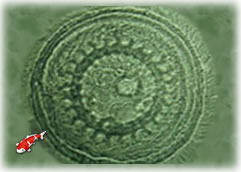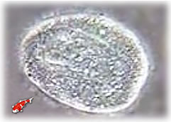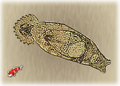 Trichodina : Trichodina is een eencellige schotell-vormige parasiet die op de huid en kieuwen voorkomt. Hij gebruikt de vis alleen maar als vervoermiddel, tijdens het vervoer hecht hij zich vast aan de vis en beschadigt zo de slijmhuid. Deze beschadigde slijmhuid kan weer aanleiding zijn tot snelle vermeerdering van deze parasiet. De parasiet kan tot in de vis en zelfs tot in de darmen doordringen, hij schaaft met zijn trilhaartjes het celmateriaal weg, het celmateriaal gebruikt hij weer als voedsel. Trichodina doet het goed in vervuild water, en is dan ook vaak met andere parasieten te vinden. |