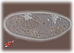 Tetrahymena sp : Tetrahymena sp. is een eencellig wimperdiertje, en behoort tot de ciliaten en heeft een ovale vorm. Die in jonge vorm erg op witte stip lijkt, maar met een goede microscoop bij een voldoende grote vergroting is het verschil goed te zien. De parasiet zwemt vrij rond, het liefst in zeer vervuild organisch water. Ze vermenigvuldigen zich zeer snel op verzwakte vissen door celdeling, en de parasiet brengt ernstige schade toe aan geïnfecteerd weefsel van de huid en de kieuwen. Het is meestal niet vast te stellen wat het schuren van de vissen veroorzaakt omdat vaak meerdere andere infecties aanwezig zijn. In een verder gevorderd stadium zal de huid van de vis verkleuren. Onder de microscoop is Tetrahymena goed te herkennen bij een vergroting van 100x tot 200x, ze komen altijd in grote aantallen voor. Het is belangrijk om goed te kijken naar andere parasieten omdat Tetrahymena meestal voorkomt op vissen die al aangetast zijn door andere parasieten. Als je Tetrahymena op je vissen aantreft duidt dit meestal op een slechte waterkwaliteit met hoge nitriet en nitraatwaarde en op slechte verzorging en dus op verzwakte en stervende vissen. |