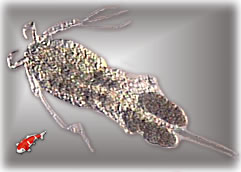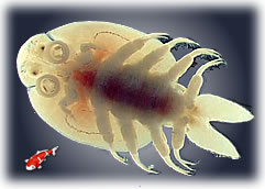Argulus of Karperluis : De Argulus is een van de meest voor-komende parasieten op vijvervissen, de Argulus kan ongeveer 10 mm groot worden en heeft een ronde vorm met twee schotelvormige zuignappen. Tussen deze zuignappen zitten de naaldvormige delen van de mond, waarmee de Argulus zich door de huid van vis dringt. De klieren van de Argulus produceren een vergif wat door de holle naalden stroomt, met een zaagachtige bewegingen van de mond breekt de Argulus het aangetaste weefsel open. De schade die ze bij de vis aanbrengen bestaat uit het onttrekken van bloed vloeistof en weefselsappen, Op de plaats waar een Argulus heeft gezeten vormt zich een opvallende rode plek op de vis. De huid van de vis raakt erg geïrriteerd door de aanwezigheid van de Argulussen, de vis zal gaan schuren en uit het water gaan springen. Op de verwondingen kunnen ook weer infectie van bacterïen of schimmels komen. Als de vis niet snel behandeld wordt is hij meestal reddeloos verloren. De levenscyclus van de Argulus is als volgt: De volwassen Argulussen zitten met hun zuignappen op de vissen, de volwassen vrouwtjes verlaten de vis om hun eitjes te leggen in gelatineachtige capsules, waarnaar de jonge Argulussen diversen groeistadia doorlopen waaruit ze steeds weer vervellen. Bij watertemperaturen van boven de 16 graden stoppen de vrouwtjes met het leggen van de eitjes. |