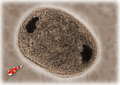 Witte stip : Witte stip is de meest bekende en voorkomende infectie bij vissen door trilhaardiertjes (ciliaten) en is met het blote oog te herkennen aan de witte stippen op de vissen. Het ziektebeeld treedt meestal op na aankoop van nieuwe vissen, de witte stippen zijn een soort kleine blaasjes en bevinden zich onder de slijmlaag en zijn irriterend en veroorzaken schade die vaak weer een bacteriële infectie tot gevolg hebben. De parasiet boort zich als hij nog jong is door de slijmhuid heen, het volwassen stadium van witte stip zit dus niet op de vis maar onder de slijmhuid en is zo goed beschermd. De parasiet bestaat uit allemaal trilhaardjes en is dan ook zeer bewegelijk hij maakt hele gangen tussen de opper en de lederhuid, als hij volwassen is breekt hij door de opper huid heen en valt op de bodem. De parasiet heeft zich omhuld met een geleiachtige massa waar uit tussen de 250 tot 2000 cellen worden gevormd, de vermeerdering gaat dan zeer snel binnen 12 tot 20 uur verlaten de cellen het zwermstadium en gaan op zoek naar een gastheer dit moet binnen de 33 tot 60 uur gebeuren, dit is ook de enigste mogelijkheid om ze te bestrijden. We bestrijden ze dan gedurende 5 dagen en na 14 dagen herhalen we de kuur. Onder de microscoop is al vanaf 40 x de parasiet goed te zien, alleen de volwassen parasieten hebben de typische U-vormige kern. |